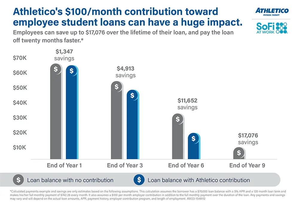 When starting a new role in the healthcare field, there’s plenty to keep you busy. From learning new systems to meeting new colleagues, the last thing you need to worry about is student debt. That’s why Athletico, through a partnership with SoFi at Work, will provide qualifying clinicians with a $100 monthly contribution (up to $1,200 annually) toward their student loans. Eligibility begins on day one of employment.